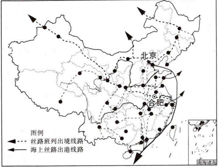 2019年,从安徽合肥发车,沿丝绸之路经济带发往中亚、欧洲的货运班列已突破百列。下图为“我国丝路班列出境与海上丝路出港部分线路示意图”。据此,完成1~2题。