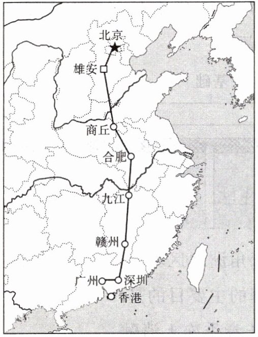 京港通道是我国规划建设的“八纵八横”高速铁路网主通道之一。下图为“京港通道示意图”。读图,完成3~4题。