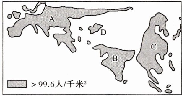 (3)D处位于青藏高原,虽被A、B、C包围,但海拔高,气候寒冷,空气稀薄,自然条件恶劣,不适宜人类大规模居住,所以只形成孤岛。