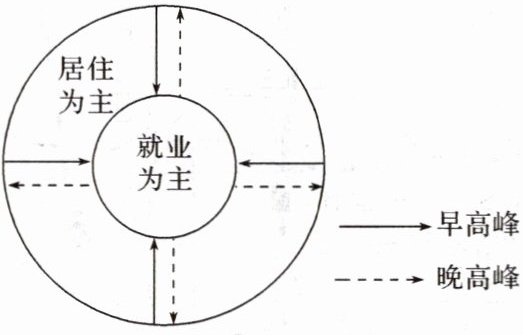 【解析】:1. 题目考查交通拥堵的原因。图中显示早高峰大量人口从“居住为主”的外围区域向“就业为主”的中心区域通勤,晚高峰则相反,说明工作地点和居住地分离明显,即职住分离显著,这是导致交通拥堵的主要原因。交通建设落后、公共服务低效、城市环境恶化在图中未体现,所以选B。