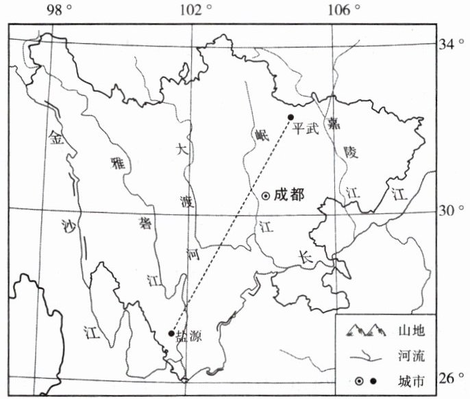 四川省是我国人口大省,人口分布极不均衡,以平武—盐源一线为界,川东与川西人口分布差异悬殊。四川省也是我国农村留守儿童数量较多的省份之一,其中川东丘陵山区农村留守儿童数量较多,成都农村留守儿童现象并不突出。下图示意四川省平武—盐源人口界线。据此,完成12~14题。