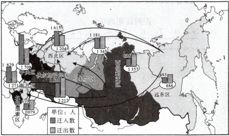 俄罗斯地跨欧亚两洲,位于欧洲东部和亚洲大陆的北部;有世界最大储量的矿产和能源资源,但主要分布在东部的高原与山地;人口分布极不均衡,主要集中在西部发达地区。读“某年俄罗斯国内人口迁移示意图”,完成10~11题。