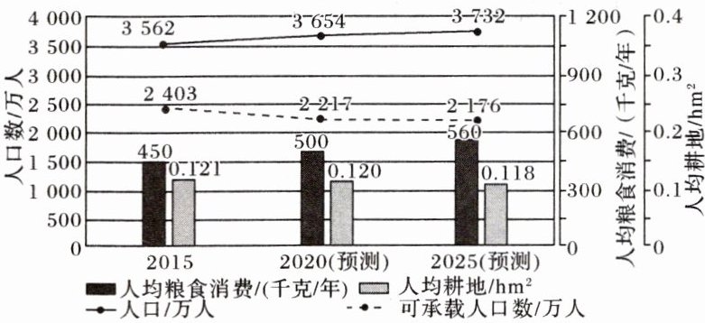 【解析】:19. 人口承载力与资源、科技、消费水平等相关。图中2015 - 2025年人均耕地略有下降,人均粮食消费上升(450→500→560千克/年),人口缓慢增长。消费水平提高会降低人口承载力,C正确;人口数量不是承载力变低的原因,A错误;科技进步应提高承载力,B错误;耕地总量可能因人均耕地下降而减少,D错误。