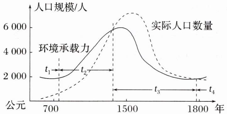 考古发现,孤悬于南太平洋中部的复活节岛大约在公元600年前开始出现人类活动。下图为“复活节岛人口总量与环境承载力的关联图”。读图,完成3~4题。