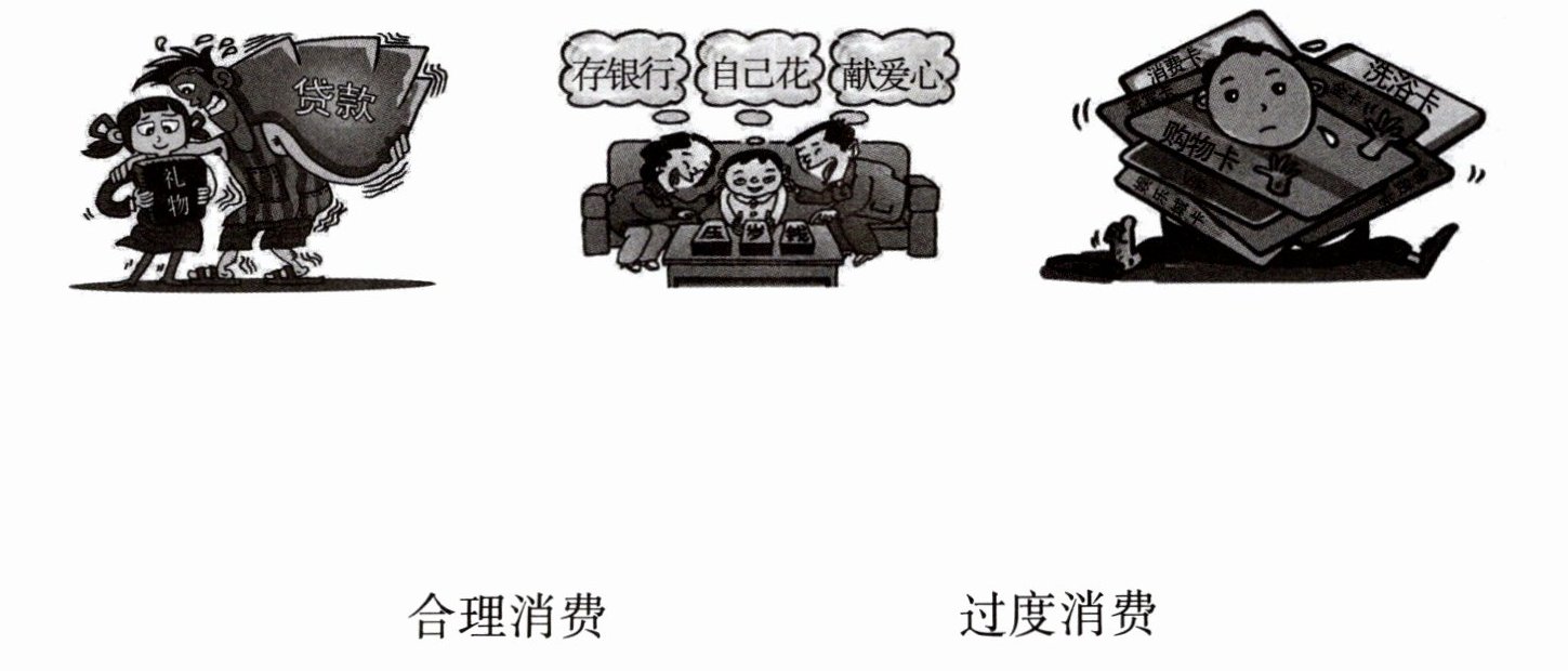 第二幅图连合理消费;第一幅图、第三幅图连过度消费。还知道的合理消费行为:购物前列清单、按需购买;不买价格过高的非必需品;把零花钱存起来买学习用品。