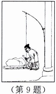 9. 新情境 传统文化 (绥化三模)明代科学家宋应星所著的《天工开物》是世界上第一部关于农业和手工业生产的综合性著作。在书中记载的“悬弓弹棉”中,将木弓用细绳吊在一根竹竿上,如图所示,竹竿发生了
