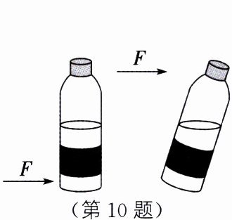 10. (周口郸城期末)如图所示,放在水平桌面上的饮用水瓶,手指用大小相同的力F分别在底部和瓶盖处水平推瓶子,前者使瓶子沿水平方向平稳移动,后者则使瓶子翻倒。这是由于两次力的