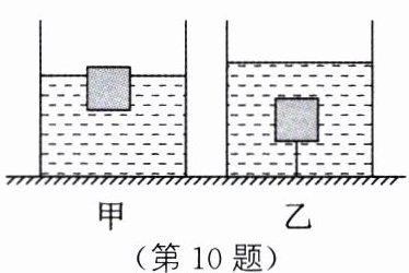 10. 放在水平桌面上的薄壁圆柱形容器(容器质量不计)底面积为$10⁻^4 m^2,$将一体积为$2×10⁻^4 m^3$的木块放入水中静止时,有1/5体积露出水面,如图甲所示;用一根质量和体积不计的细线把容器底和木块底部中心连接起来,如图乙所示。下列说法中,错误的是(已知ρ水$ = 1.0×10^3 kg/m^3,g$取10 N/kg) (
