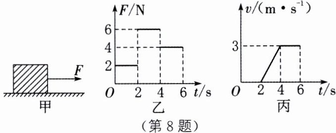 8. (眉山中考)如图甲所示,粗糙程度不变的水平地面上,物体受到水平向右的拉力。拉力大小随时间变化的关系如图乙所示,物体运动的速度随时间变化的关系如图丙所示。下列说法中,正确的是 (