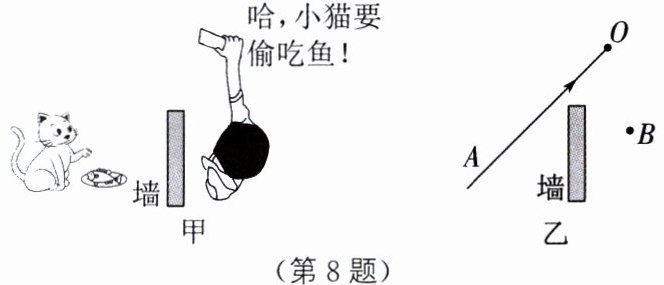 8. 跨学科实践 日常生活(成都中考)如图甲所示,小孟利用一面小镜子隔着墙看到院里的小猫要偷吃鱼。如图乙所示,AO表示来自小猫的入射光线,O为入射点,B点为小孟眼睛所在的位置。请在图乙中完成作图: