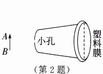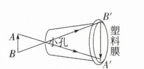 2. (白银中考)如图所示为小强在纸杯上蒙上一层塑料膜做小孔成像实验的情景,请在图中作出烛焰(用箭头AB表示)在塑料膜上成的像(用箭头$A'B'$表示)及光路图。