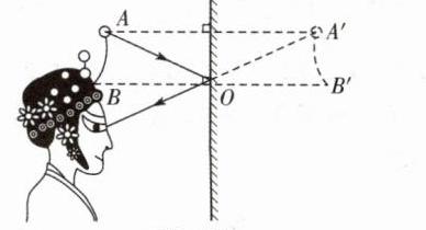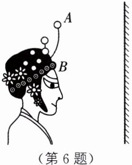 6. 如图所示为某戏曲演员在平面镜前化妆的情景。请在图中画出演员头饰中AB段在平面镜中的像,并画出演员通过平面镜看见头饰上A球的光路图。
