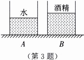 3. 如图所示,A、B两个完全相同的圆柱形容器放在水平桌面上,分别装有相等质量的水和酒精,容器的底面积为30cm^2,A容器内水的深度为20cm。(已知$\rho_{酒精}= 0.8×10^{3}kg/m^{3}$,$\rho_{铁}= 7.9×10^{3}kg/m^{3}$,$\rho_{铝}= 2.7×10^{3}kg/m^{3}$)