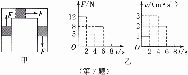 7. 如图甲所示,利用拉力F将木块从一个弯折的管道左端拉进,右端拉出。已知竖直管道对木块的挤压作用完全相同,并测得木块移动过程中拉力和木块移动的速度随时间变化的图像如图乙所示。下列说法中,正确的是 (