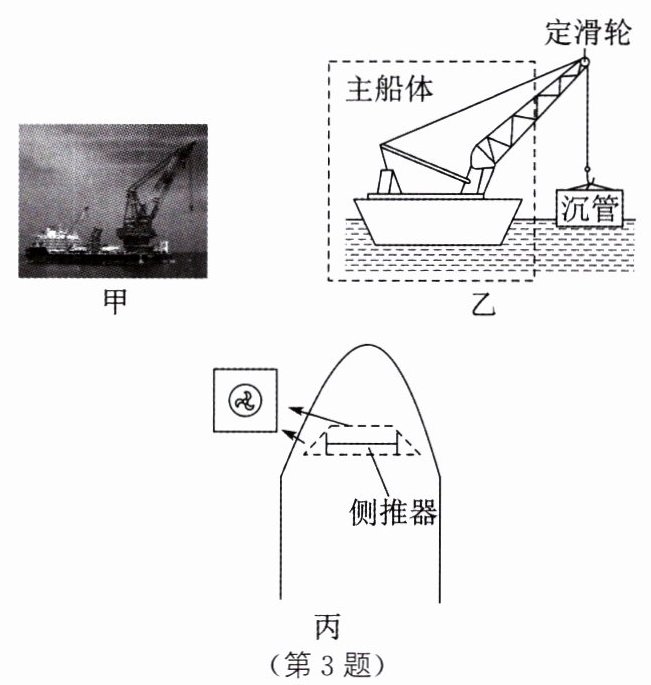 (3)“振华30”在安装沉管的过程中,若因为流向,造成洋流仅对船体左侧产生$F= 5.5×10^{4}N$的冲击力,如图丙所示,为了保持船体平稳,需开启