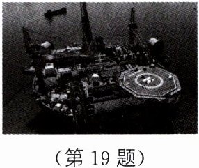 19.(8分)新情境 科技民生(深圳中考)如图所示,“海葵一号”是中国自主设计并建造的亚洲首艘浮式生产储卸型装置,“海葵一号”漂浮在大海上作业,从空中俯瞰时像一朵绽放的葵花。傲傲同学查阅资料得知:“海葵一号”的质量是$3.7×10^{7}kg$,满载时排开海水的质量是$1.0×10^{8}kg$。(g取10N/kg,海水的密度取$1.0×10^{3}kg/m^{3}$)