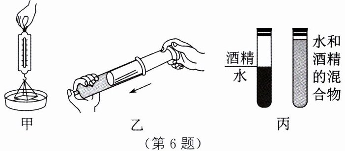 (3)如图丙所示,将酒精与染色的水密封在试管中,开始时界面十分清晰,一段时间后两种液体混合均匀且总体积减小。液体混合后总体积变小,说明分子之间有