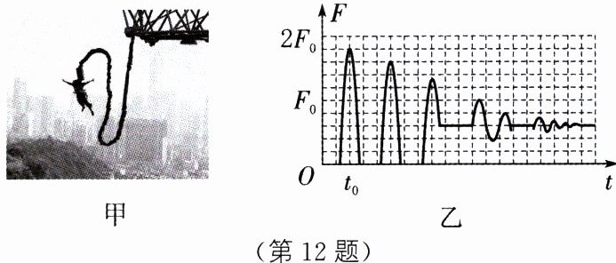12. 如图甲所示,“蹦极”就是跳跃者把一端固定的长弹性绳绑在踝关节等处,从几十米高处跳下的一种极限运动。某运动员做蹦极运动时,所受绳子拉力F的大小随时间t变化的情况如图乙所示(将蹦极过程近似为在竖直方向的运动),根据图像可知: