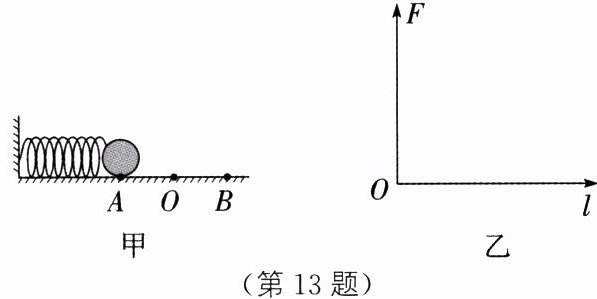 13. 如图甲所示,在粗糙程度相同的水平台面上,将一轻质弹簧左端固定,右端连接一金属小球,O点是弹簧保持原长时小球的位置。开始时小球通过压缩弹簧到A位置(已知AO= OB),释放小球,请在图乙中画出小球从开始释放至移动到最右端所受的合力随移动距离的大致变化图像(不计空气阻力)。
