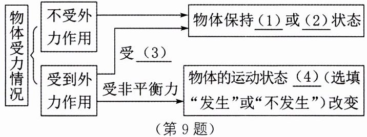 9. 如图所示,小嘉将运动和力的关系以概念图的形式进行了梳理,请将空缺(1)~(4)补充完整。