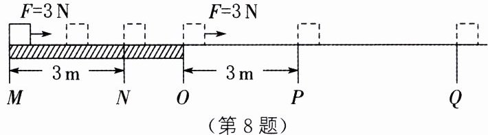 8. 如图所示,水平地面上O点的两侧粗糙程度不同,物体在沿水平方向3N的力F的作用下向右运动,从物体经过M点开始计时,每经过相同时间,用虚线记录物体的位置,物体在MO段做匀速直线运动,则物体在
