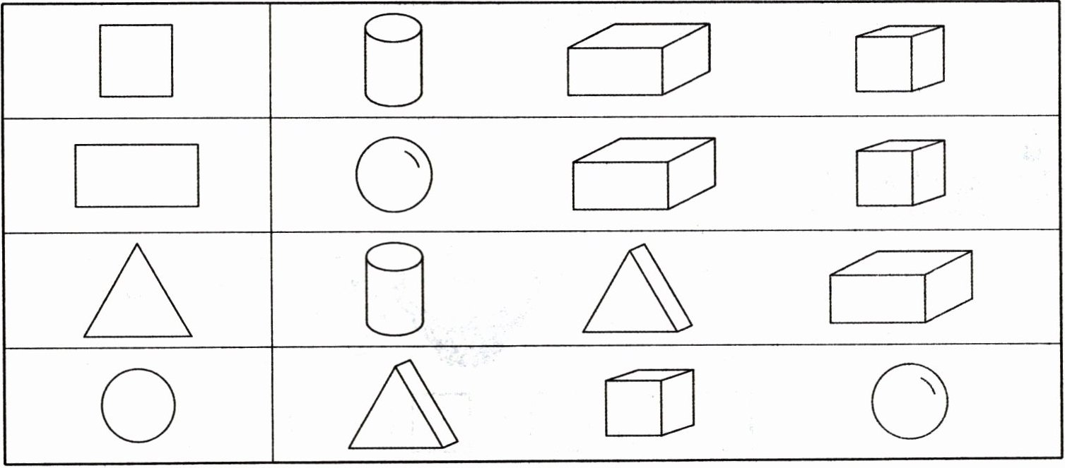 (圈出的物体依次为)1. 第三列正方体 2. 第二列长方体 3. 第二列三棱柱 4. 第三列球体