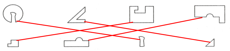 2. 看看从右边的哪个物体上可以找到左边的图形,把它圈起来。