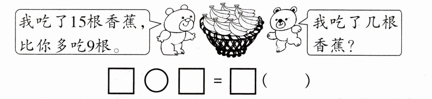 已知左边小熊吃了$15$根香蕉,且比右边小熊多吃$9$根,求右边小熊吃的香蕉数量,用减法计算,可列出算式:$15 - 9 = 6$(根)。