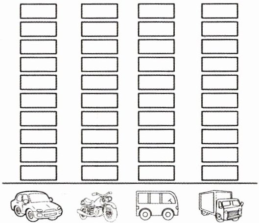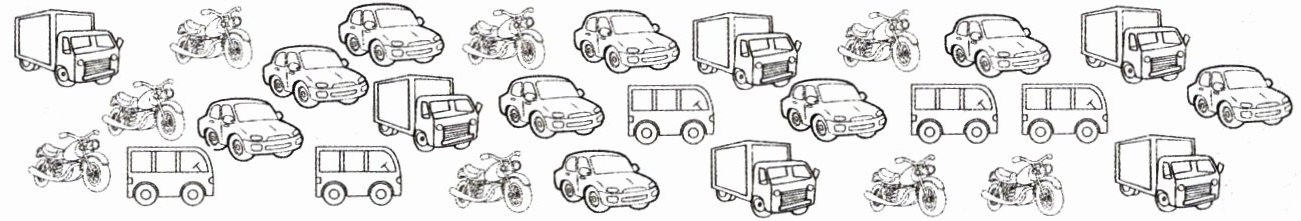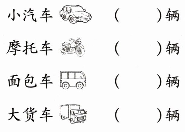 2. 小汽车$9$辆,摩托车$8$辆,面包车$5$辆,大货车$6$辆。