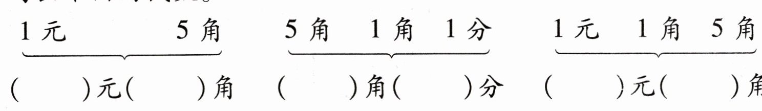 第三组:左边是$1$元,中间是$1$角,右边是$5$角,$1 + 1 + 5 = 7$(角),合起来就是$1$元$7$角,写成小数形式是$1.7$元。