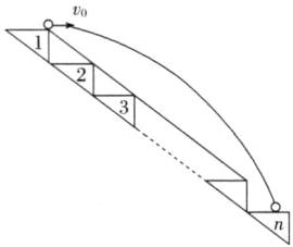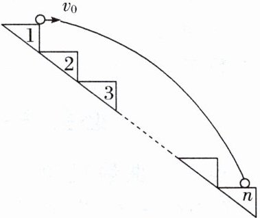 D [如图作一条连接各端点的直线,只要小球越过该直线,则小球落到台阶上。设小球落到斜线上的时间为t,根据平抛规律,有水平方向 $ x = v_0 t $,竖直方向 $ y = \frac{1}{2} g t^2 $,依题意有 $ \frac{x}{y} = \frac{20}{15} = \frac{4}{3} $,解得 $ t = 0.75 s $,相应的水平距离 $ x = v_0 t = 5 × 0.75 m = 3.75 m $,则台阶数 $ n = \frac{3.75}{0.2} = 18.75 $,因小球从第1号台阶末端抛出,知小球抛出后首先落到的台阶为第20级台阶。故D正确,ABC错误。]