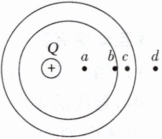 D [导体腔达到静电平衡时,导体腔是一个等势体,b点位于导体腔内壁上,c点位于导体腔内、外壁之间,则$\varphi_{b}=\varphi_{c}$,导体腔内部电场线由正电荷位置出发指向导体腔内壁,外部电场线由导体腔外壁出发指向无穷远,由沿电场线方向电势逐渐降低知,$\varphi_{a}>\varphi_{b}$,$\varphi_{c}>\varphi_{d}$,则$\varphi_{a}>\varphi_{b}=\varphi_{c}>\varphi_{d}$,故D正确,ABC错误。]