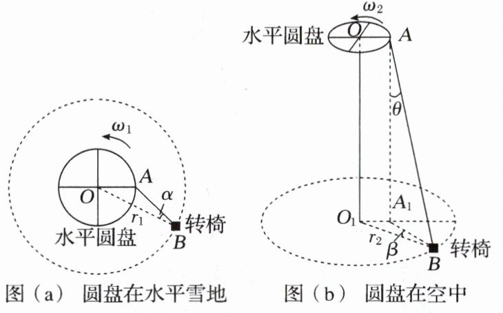 (2)将圆盘升高,如图(b)所示。圆盘匀速转动,转椅运动稳定后在水平雪地上绕 $ O_1 $ 点做半径为 $ r_2 $ 的匀速圆周运动,绳子与竖直方向的夹角为 $ \theta $,绳子在水平雪地上的投影 $ A_1B $ 与 $ O_1B $ 的夹角为 $ \beta $。求此时圆盘的角速度 $ \omega_2 $。