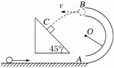 4. (多选)(2025·陕西省西工大附中高二期末)如图所示,一个固定在竖直平面内的半圆形管道,管道里有一个直径略小于管道内径的小球,小球以某一速度从A点进入管道,从最高点B离开管道后做平抛运动,经过0.4s后又恰好与倾角为45°的斜面垂直相碰于C点。已知半圆形管道的半径R= 1m,小球可看成质点,重力加速度g取$10m/s^2,$则 (