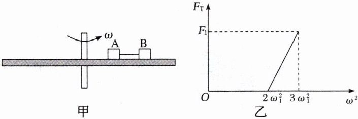 2. (多选)(2025·四川省成都七中高一月考)如图甲所示,将质量为$m_1$的物块A和质量为$m_2$的物块B沿同一半径方向放在水平转盘上,两者用长为L的水平轻绳连接。物块与转盘间的最大静摩擦力均为各自重力的k倍,物块A与转轴的距离等于轻绳长度,整个装置能绕通过转盘中心的竖直轴转动。开始时,轻绳恰好伸直但无拉力,现让该装置从静止开始转动,使角速度缓慢增大,绳中拉力F_T与$ω^2$的关系如图乙所示,当$ω^2$超过$3ω_1^2$时,物块A、B开始滑动。若图乙中的$F_1、$$ω_1$及重力加速度g均为已知,下列说法正确的是 (