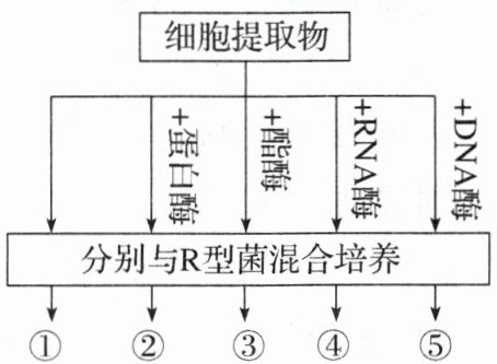 B [ABD. 从题图所示实验过程可知, 向 S 型菌的提取物中分别加入蛋白酶、酯酶、RNA 酶和 DNA 酶, 是利用了酶的专一性的特点, 以除去相应的分子, 然后进行研究, 利用了减法原理, 属于对比实验(相互对照), 但并没有把这些物质分离开, B 错误、AD 正确; C. 肺炎链球菌的遗传物质是 DNA, 因而①~⑤组混合培养后, 只有第⑤组不会出现 S 型菌, 其他组均会出现 S 型菌, C 正确。故选 B。]