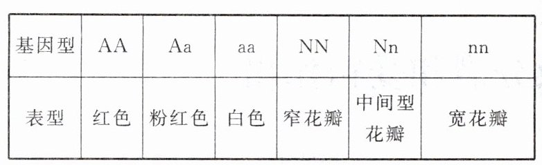 C [A. 基因A和基因N的本质区别是碱基的排列顺序不同,A错误;B. A、a是等位基因,位于同源染色体上,出现粉红花(Aa)是基因分离造成的,B错误;C. 由题意知,A、a和N、n独立遗传,因此遵循自由组合定律,且A对a、N对n是不完全显性,白色宽花瓣植株的基因型是aann,与一亲本进行杂交得到子一代,子一代的基因型中至少含有一个a、一个n,子一代测交,测交后代中宽花瓣:中间花瓣=$1:1$,相当于一对测交实验,子一代的基因型是Nn;而粉红:白色=$1:3$,粉红色占$Aa = 1/4$,可以写成$1/2×1/2$,因此子一代的基因型是$Aa:aa = 1:1$,因此考虑2对相对性状,子一代的基因型是2种,即AaNn、aaNn,又知亲本中一个表型是白色宽花瓣(aann),所以未知亲本的基因型是AaNN,表现为粉红花窄花瓣,C正确;D. 子一代的基因型为AaNn、aaNn,表现为粉红色中间型花瓣和白色中间型花瓣,D错误。故选C。]