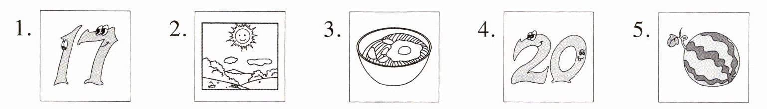 1. seventeen 2. picture 3. noodles 4. twenty 5. watermelon