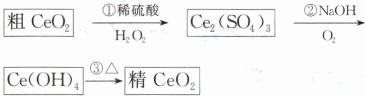 解析 粗 $CeO_{2}$ 在稀硫酸条件下与双氧水发生氧化还原反应生成 $Ce_{2}(SO_{4})_{3}$ 和氧气,$Ce_{2}(SO_{4})_{3}$ 在氢氧化钠条件下与氧气反应生成 $Ce(OH)_{4}$,$Ce(OH)_{4}$ 受热分解生成 $CeO_{2}$。