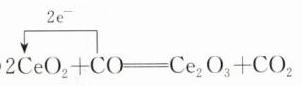 (5)根据图示可知反应 ① 为 CO 和 $CeO_{2}$ 反应生成 $Ce_{2}O_{3}$ 和 $CO_{2}$,化学方程式为:$CO + 2CeO_{2}=Ce_{2}O_{3}+CO_{2}$,反应中 C 元素由 +2 价升高为 +4 价,Ce 元素由 +4 价降为 +3 价,转移电子数最小公倍数为 2。