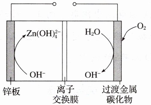 C.放电时,$\text{OH}^{-}$由过渡金属碳化物通过离子交换膜向锌板移动