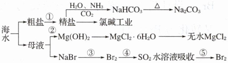 C [由流程可知,海水晒盐得到粗盐和母液,粗盐精制得到精盐,制成氯化钠饱和溶液,通入氨气、二氧化碳反应生成碳酸氢钠晶体,过滤得到碳酸氢钠,碳酸氢钠受热分解得到碳酸钠,电解饱和食盐水生成氯气、氢气和氢氧化钠为氯碱工业;母液加入石灰乳沉淀镁离子生成氢氧化镁沉淀,过滤后沉淀溶解得到氯化镁溶液,蒸发浓缩析出氯化镁晶体,在氯化氢气流中失去结晶水得到固体氯化镁;溴化钠溶液中通入氯气氧化溴离子生成溴单质,溴单质被二氧化硫水溶液吸收后,再通入氯气发生氧化还原反应生成溴单质,达到富集溴的目的,以此来解答。A.步骤①,粗盐制取精盐的过程中需要除去溶液中的杂质离子,因此发生化学变化,A 错误;B.氢氧化钙微溶,步骤②,用熟石灰代替氢氧化钠主要原因是熟石灰的来源丰富,价格便宜,B 错误;C.在步骤③④⑤中,只有步骤③与步骤⑤中的溴元素被氧化,步骤④中溴元素被还原,C 正确;D.酒精和水互溶,因此从步骤⑤所得溶液中分离出单质溴的方法不能用酒精萃取,应该用苯或四氯化碳,D错误;故选 C。]
