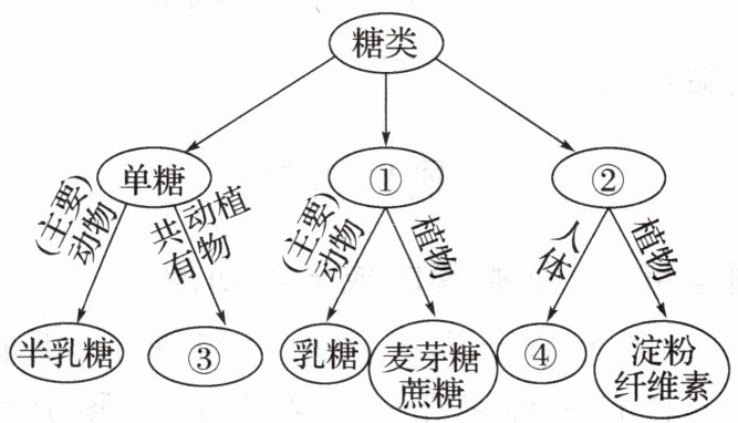 C [A. 图中①与②分别为二糖和多糖,两者都能被水解,二糖可以水解为 2 个单糖,多糖可以水解为多个单糖,A 错误;B. 图中的③表示动植物共有的糖,除了葡萄糖外,还有核糖和脱氧核糖,B 错误;C. 图中的②是多糖,包括糖原、淀粉和纤维素,它们的水解产物中都有葡萄糖,C 正确;D. 图中的④表示糖原,有肌糖原和肝糖原,肌糖原不能与血液中的葡萄糖相互转化,肝糖原能与血液中的葡萄糖相互转化,以维持血糖浓度的相对稳定,D 错误。故选 C。]
