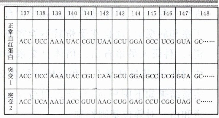 BCD [A. 由表格可知,正常血红蛋白142密码子为UAA,突变1的142密码子为CAA,可推知突变1是血红蛋白基因中A-T替换为G-C引起的,A正确;B. 正常血红蛋白142位的密码子UAA为终止密码子,而突变1的142位的密码子为CAA,对应谷氨酰胺,导致终止密码子延后出现,最终导致肽链长度变长,氨基酸序列改变,B错误;C. 由表格可知,突变2的140位密码子以及其后都与正常血红蛋白的密码子不同,可知突变2是基因中碱基对的缺失引起的,导致终止密码子延后出现,最终导致肽链长度变长,C错误;D. 突变2和突变1最后的结果都是肽链长度变长,无法确定对生物性状影响的大小,D错误。故选BCD。]