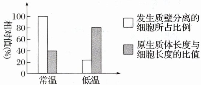 B [A. 题意显示,两组实验植物细胞的初始质壁分离平均时间为 2.4 min、3.5 min,而温度会影响物质的运动,因此,低温组植物细胞的初始质壁分离平均时间为 3.5 min,A 错误;B. 细胞壁对植物细胞具有支持和保护作用,因此,若没有细胞壁的保护,原生质体可能会吸水膨胀至破裂,B 正确;C. 因为低温条件下物质运动速度较慢,因此,低温组发生质壁分离细胞的液泡颜色比常温组浅,C 错误;D. 蔗糖不能自由地通过细胞膜,D 错误。故选 B。]