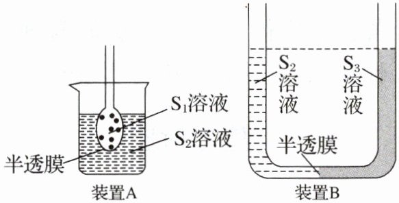 D [A. 实验起始时,由于装置 A 中的 $ S_1 $ 溶液浓度大于 $ S_2 $,故漏斗中的液面会上升,加酶后,酶能催化蔗糖水解为葡萄糖和果糖,使 $ S_1 $ 溶液浓度增大,漏斗中液面继续上升,由于葡萄糖能够通过半透膜进入 $ S_2 $,使 $ S_1 $ 与 $ S_2 $ 溶液浓度差减小,漏斗中的液面会下降至稳定,A 错误;B. 若不加入酶,装置 A 达到渗透平衡后,由于漏斗中溶液存在重力势能,水分子进出半透膜速率相等,但装置 A 中漏斗内的蔗糖不可能进入烧杯中,所以 $ S_1 $ 溶液浓度仍大于 $ S_2 $ 溶液浓度,B 错误;CD. 葡萄糖属于小分子物质,可以通过半透膜,装置 B 半透膜增加一层,渗透平衡时,两侧溶液浓度相同,且装置 B 两侧液面的高度变化为 $ S_2 $ 先降低后升高,$ S_3 $ 先升高后降低,平衡后液面高度相同,C 错误,D 正确。故选 D。]