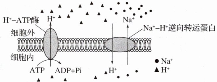 (2024·甘肃高考真题)维持细胞的$Na^{+}$平衡是植物的耐盐机制之一。盐胁迫下,植物细胞膜(或液泡膜)上的$H^{+}-ATP$酶(质子泵)和$Na^{+}-H^{+}$逆向转运蛋白可将Na^{+}从细胞质基质中转运到细胞外(或液泡中),以维持细胞质基质中的低$Na^{+}$水平(见下图)。下列叙述错误的是 (