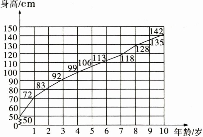 一、右面是小美的妈妈记录小美0~10岁时的身高情况统计图。