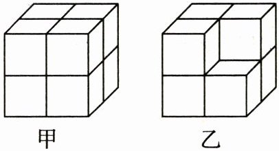 甲由8个小正方体组成,乙由7个小正方体组成。