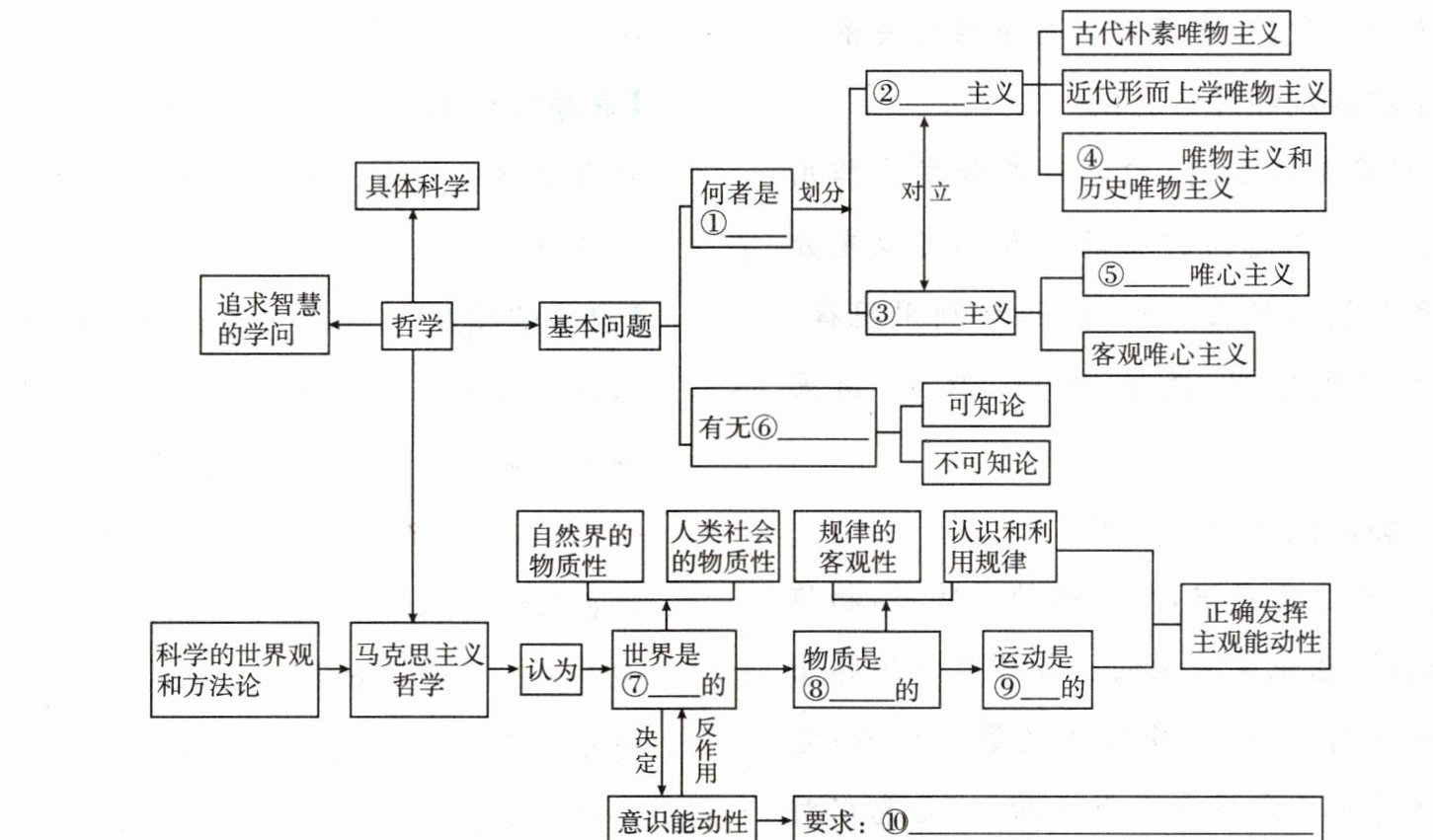 ①本原 ②唯物 ③唯心 ④辩证 ⑤主观 ⑥同一性 ⑦物质 ⑧运动 ⑨有规律 ⑩一切从实际出发、实事求是